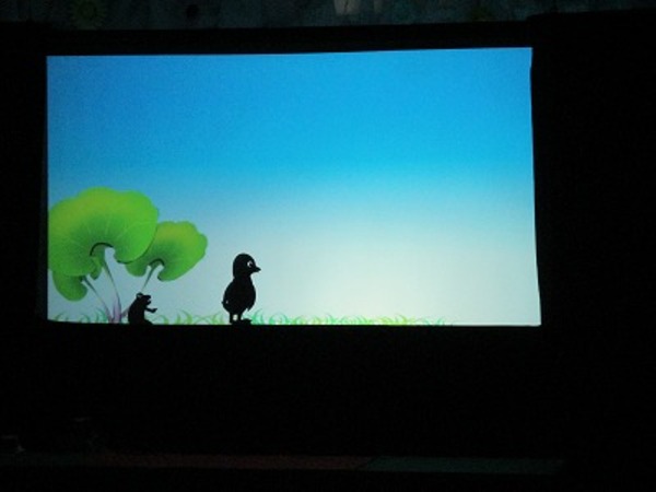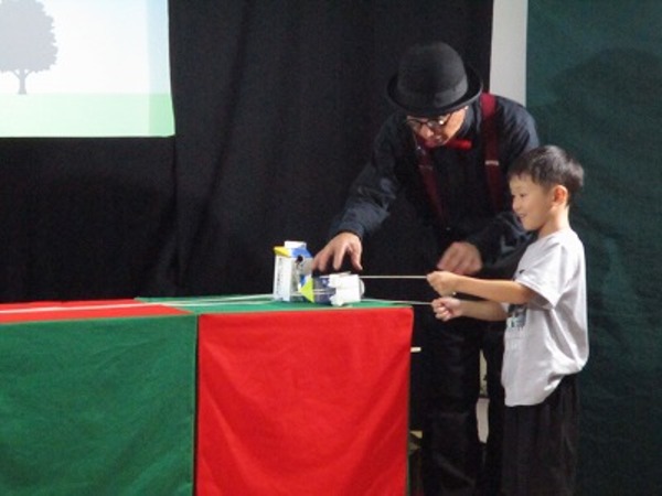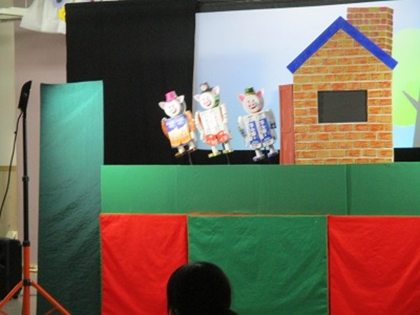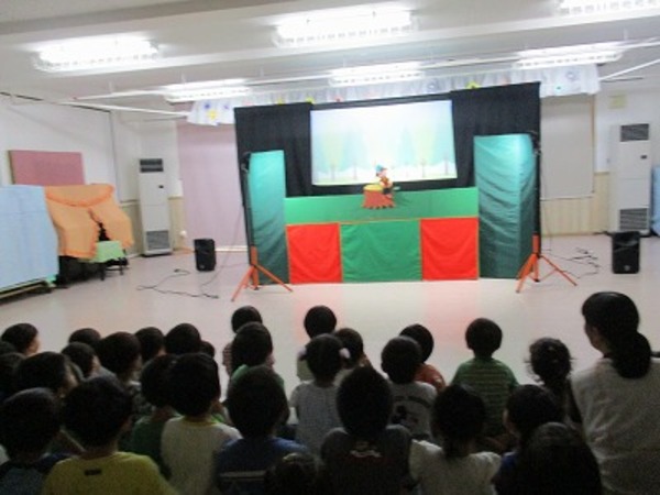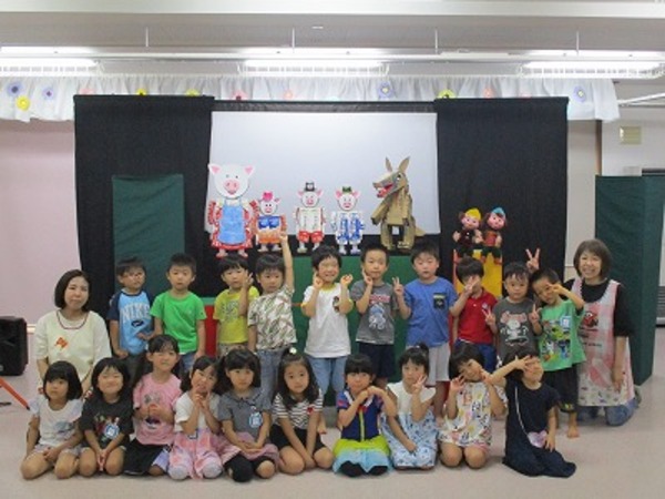 毎年楽しみにしている行事の1つの演劇鑑賞。今年もクレヨンカンパニーさんに来て頂きガラクタ人形劇「3びきのこぶた」や影絵劇「とべとべ!ペンギンくん」を見ました。子どもたちに馴染みのある3びきのこぶたのお話では、オオカミくんが出てくると「あぶなーい」「にげて〜」などこぶたくんに声援をおくりながら楽しそうに劇を見ていました。ペンギンのおもちゃを動かすコーナーでは、動く仕組みにとてもン興味をもち「すごーい!」と歓声があがっていました。影絵劇では始め会場が暗くなりドキドキしている子もいましたが、お話がはじまり影絵が動いたり、背景の色の鮮やかさにみんな見とれていました。最後に登場した人形と記念写真を撮りとても楽しい日を過ごしました。