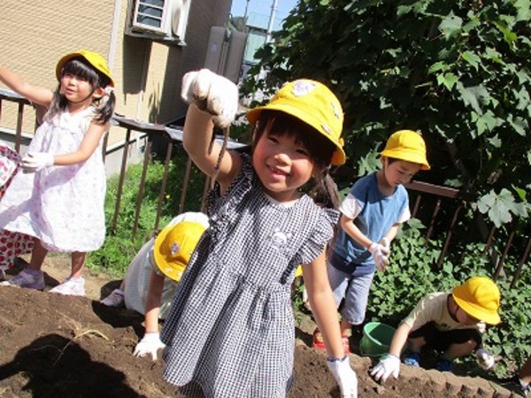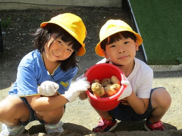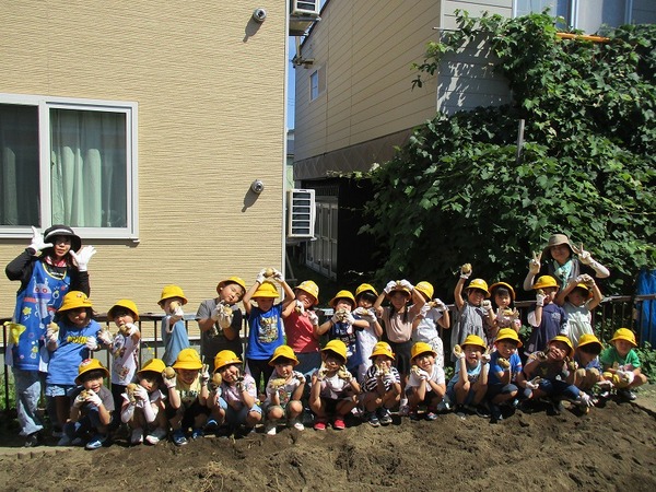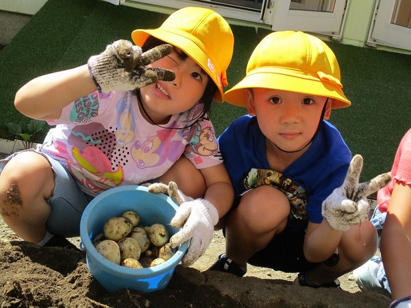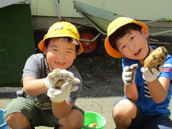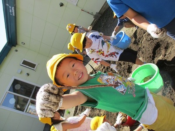 さくら組が春に植えたジャガイモが大きくなり収穫の時期を迎えました。みんな軍手を履いて準備万端でジャガイモが植えてある畑にいきました。畑ではジャガイモ堀りですが姿が見えなかったので、「どこにあるんだろう?」と不思議そうにしていましたが、土を掘って見ると大きなジャガイモがたくさん出て来て大喜びでした。それからみんなで一斉にジャガイモを掘り探しはじめました。掘っている途中で長くて大きなミミズを発見!怖がるお友達もいましたが、興味を持ち捕まえたお友達もいました。用務員さんから畑にミミズがいる畑は良い畑なんだよ」とお話を聞き、すぐに畑に戻していました。今年は去年よりも豊作でした。出来たお芋は給食でみんなで食べました。