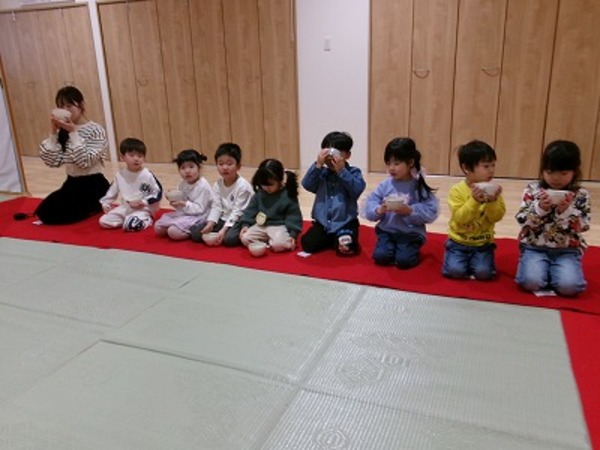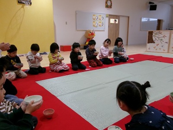 1月の茶道教室は「新年お茶会」。「初釜」ということで、普段は茶道教室に参加しないたんぽぽ組も初体験をしましたよ!お正月用のお飾りをして、お茶の先生と「あけましておめでとうございます」のご挨拶(*^_^*) たんぽぽ組はちょっぴり緊張気味でしたが、慣れた手つきでお運びしてくれるさくら組さんに「どうもありがとう」をいう事ができてとっても素敵でした♪すみれ組も2回目とあって、座り方も上手になっていたり、さくら組はお茶の点て方もスムーズになってきて成長を感じるお茶会となりました。さくら組のお茶会では、保育士がお点前を披露!子どもたちが真剣にその様子を見ていたので、点ててる保育士も「緊張した…」と言っていましたが(笑)、見事なお点前でした!!今年も茶道教室でいただくお抹茶パワーで元気に過ごしたいと思います(*^_^*)