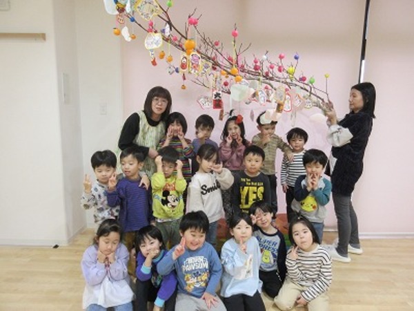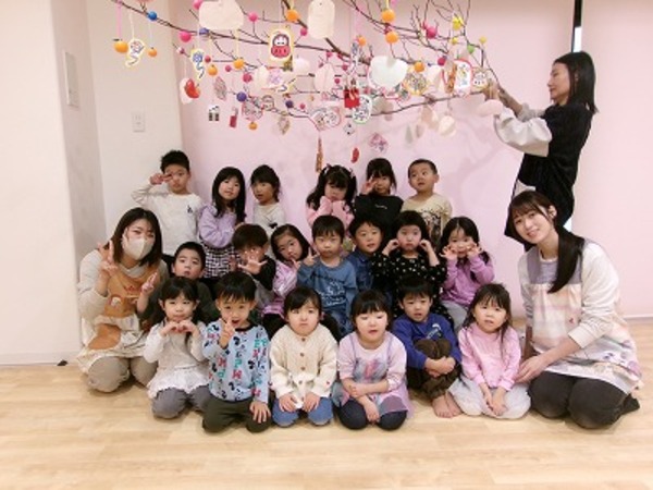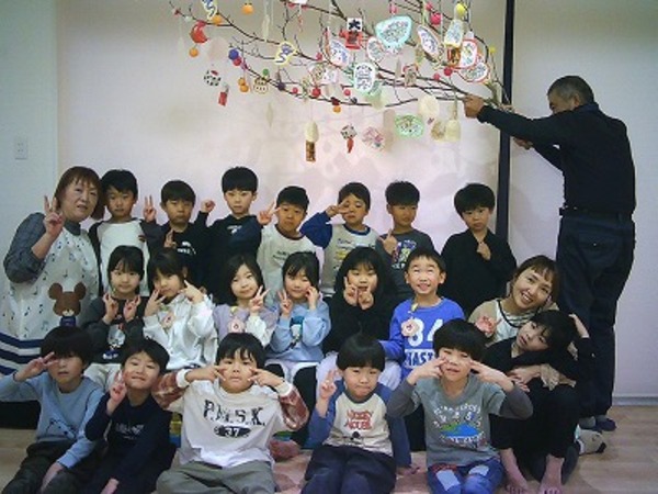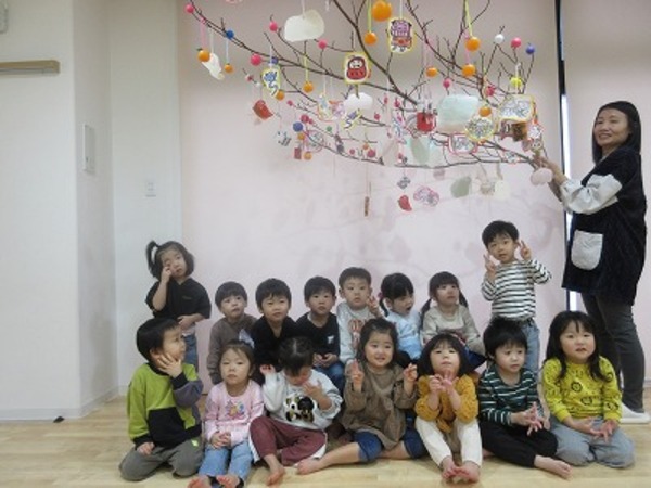 12月22日、1階のホールでお正月の準備として「まゆ玉飾り」を行いました。子どもたちが翌年もすくすく元気に育ちますように・・・と願いをこめて、まゆ玉飾りの由来をお勉強しながらまゆ玉と自分たちで色付けした飾りを「水木」という木に飾り付けしていきました。まゆ玉をつける時の力加減に苦戦しつつも(笑)、だんだんと華やかになっていく木に大喜びの子どもたちでした(*^-^*)